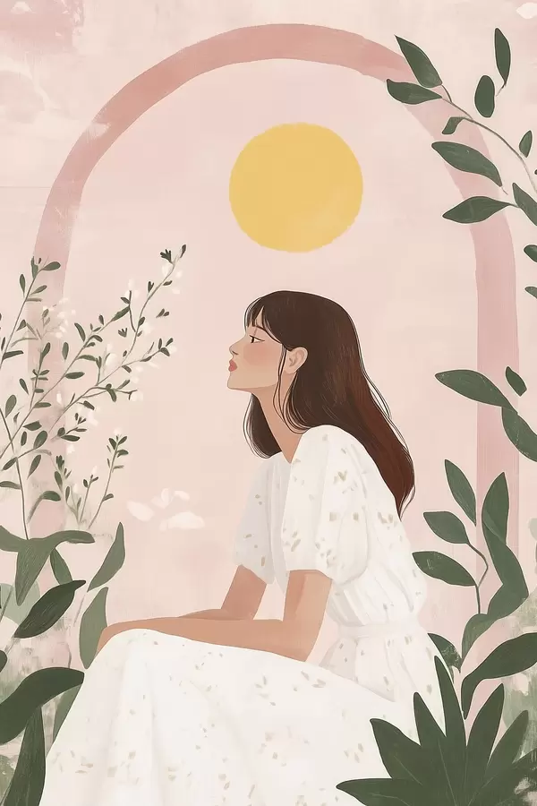 Poster Schöne Frau im tropischen Garten, Sonne, Pastellfarben Nr f44155