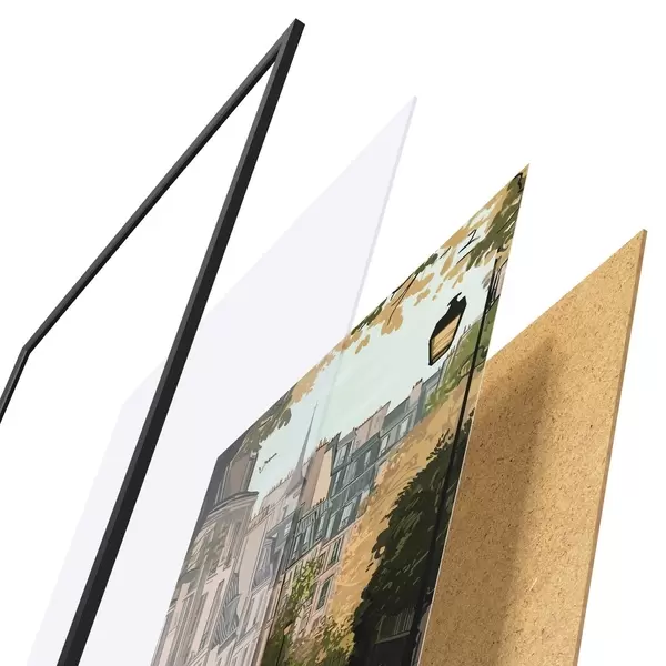 Das Poster besteht aus einem Rahmen, Plexiglas, einem gedruckten Bild und einer Rückwand aus Spanplatten. Dank der Halterungen auf der Rückseite kann das Poster sofort an die Wand gehängt werden.