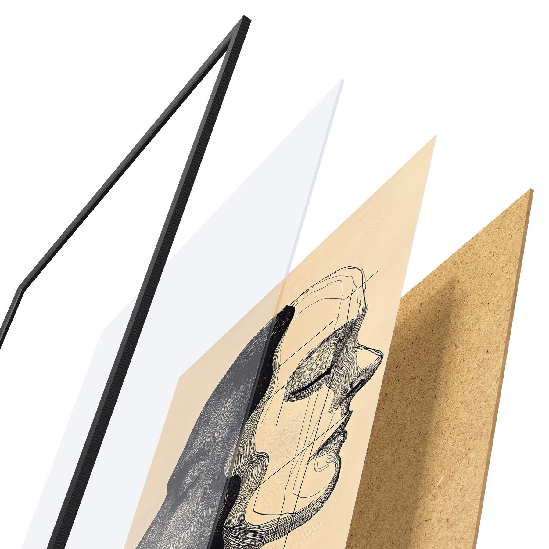 Das Poster besteht aus einem Rahmen, Plexiglas, einem gedruckten Bild und einer Rückwand aus Spanplatten. Dank der Halterungen auf der Rückseite kann das Poster sofort an die Wand gehängt werden.