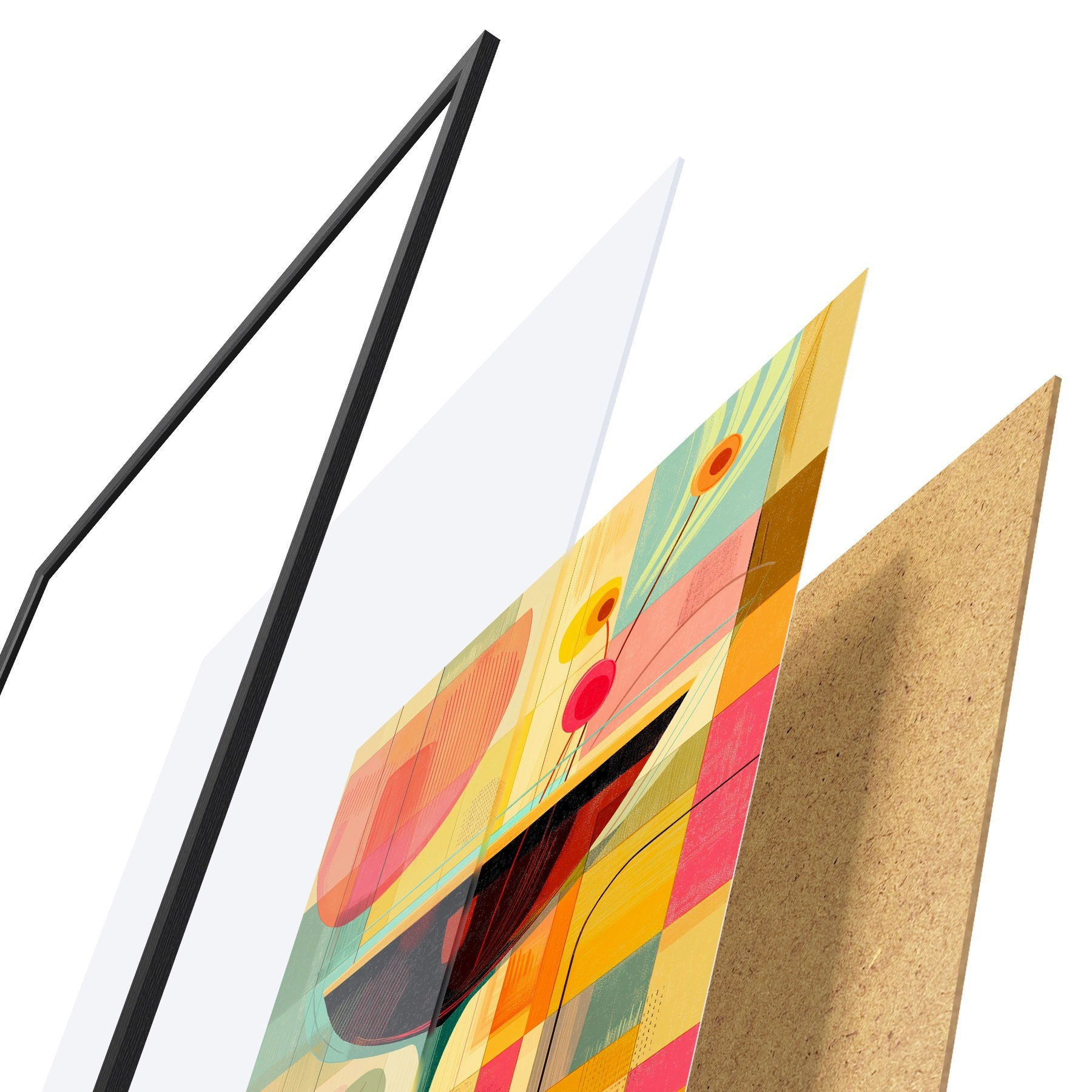 Das Poster besteht aus einem Rahmen, Plexiglas, einem gedruckten Bild und einer Rückwand aus Spanplatten. Dank der Halterungen auf der Rückseite kann das Poster sofort an die Wand gehängt werden.