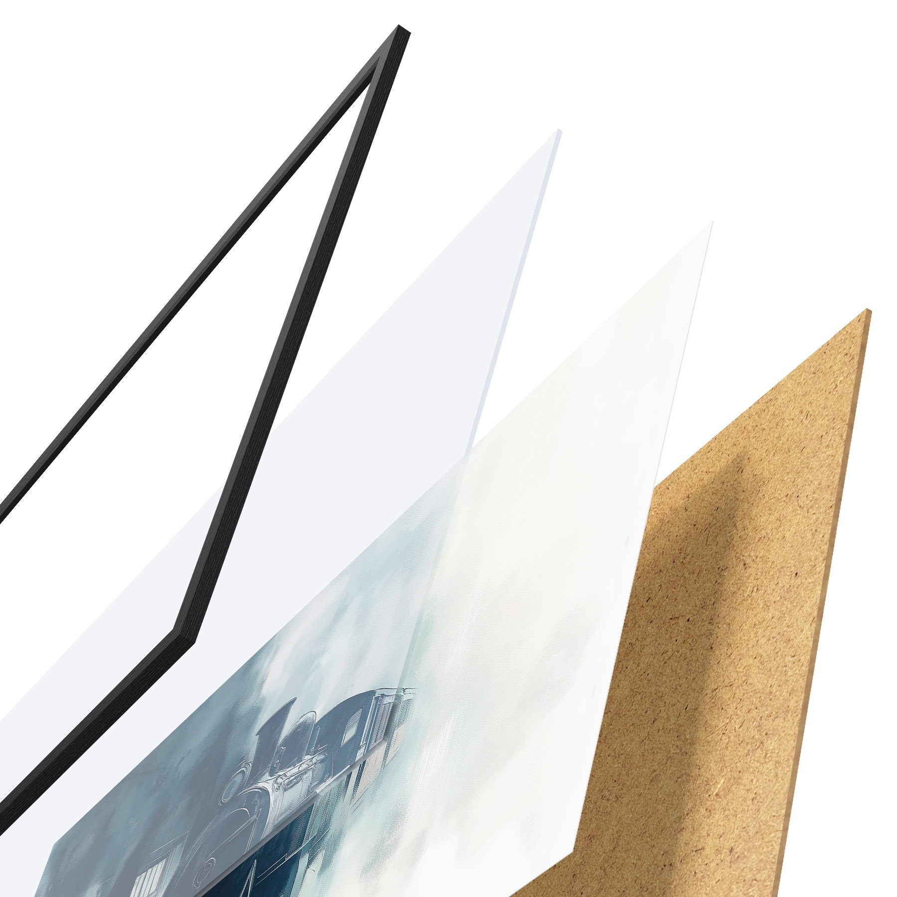 Das Poster besteht aus einem Rahmen, Plexiglas, einem gedruckten Bild und einer Rückwand aus Spanplatten. Dank der Halterungen auf der Rückseite kann das Poster sofort an die Wand gehängt werden.