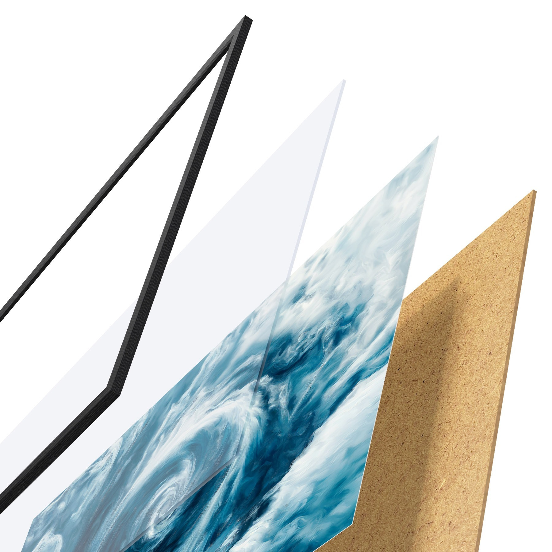 Das Poster besteht aus einem Rahmen, Plexiglas, einem gedruckten Bild und einer Rückwand aus Spanplatten. Dank der Halterungen auf der Rückseite kann das Poster sofort an die Wand gehängt werden.