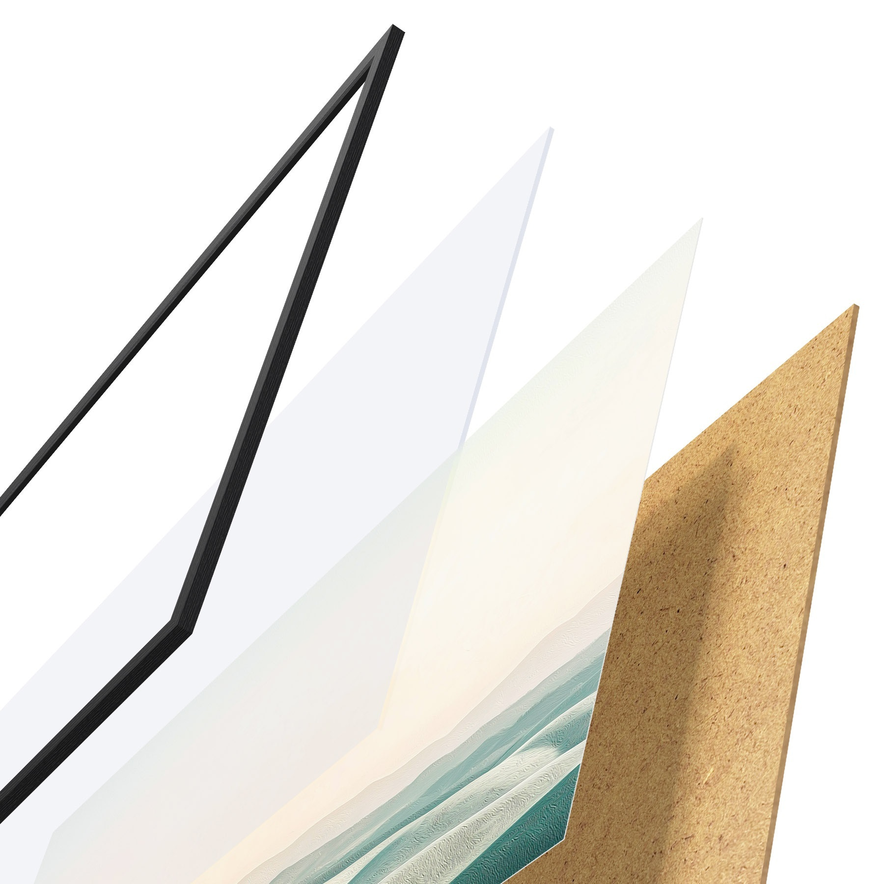 Das Poster besteht aus einem Rahmen, Plexiglas, einem gedruckten Bild und einer Rückwand aus Spanplatten. Dank der Halterungen auf der Rückseite kann das Poster sofort an die Wand gehängt werden.