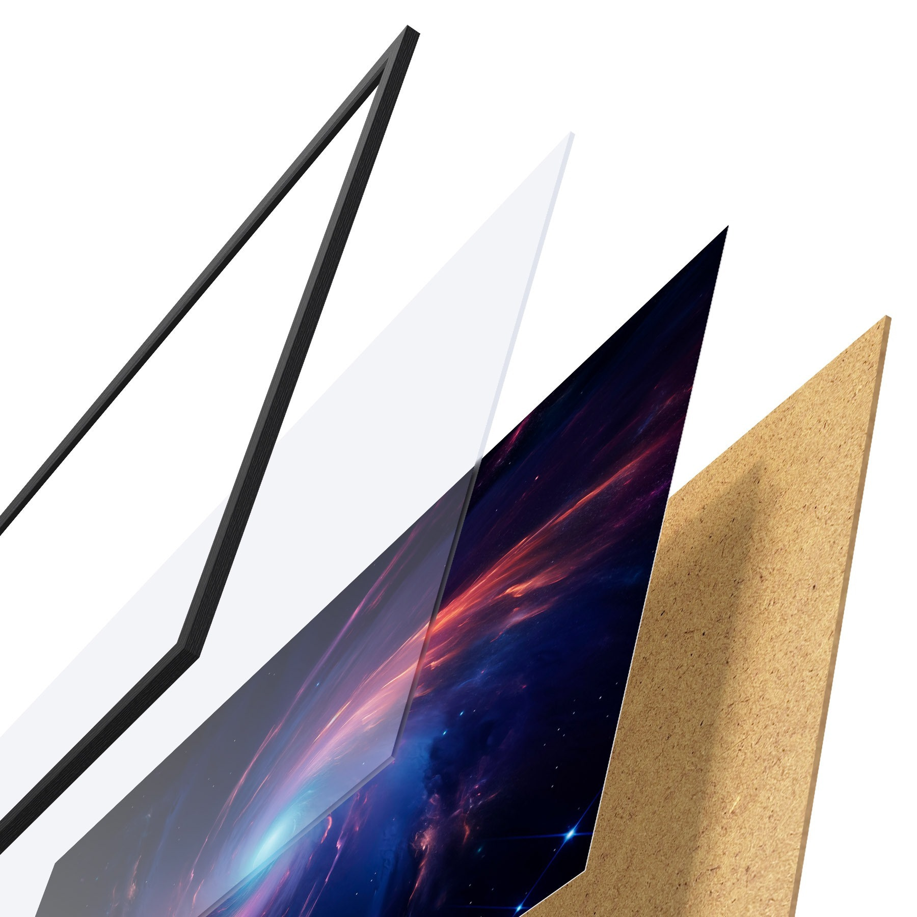 Das Poster besteht aus einem Rahmen, Plexiglas, einem gedruckten Bild und einer Rückwand aus Spanplatten. Dank der Halterungen auf der Rückseite kann das Poster sofort an die Wand gehängt werden.