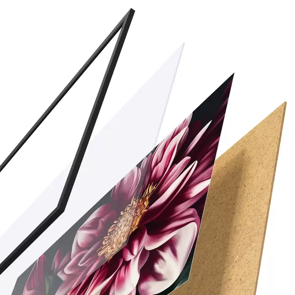 Das Poster besteht aus einem Rahmen, Plexiglas, einem gedruckten Bild und einer Rückwand aus Spanplatten. Dank der Halterungen auf der Rückseite kann das Poster sofort an die Wand gehängt werden.