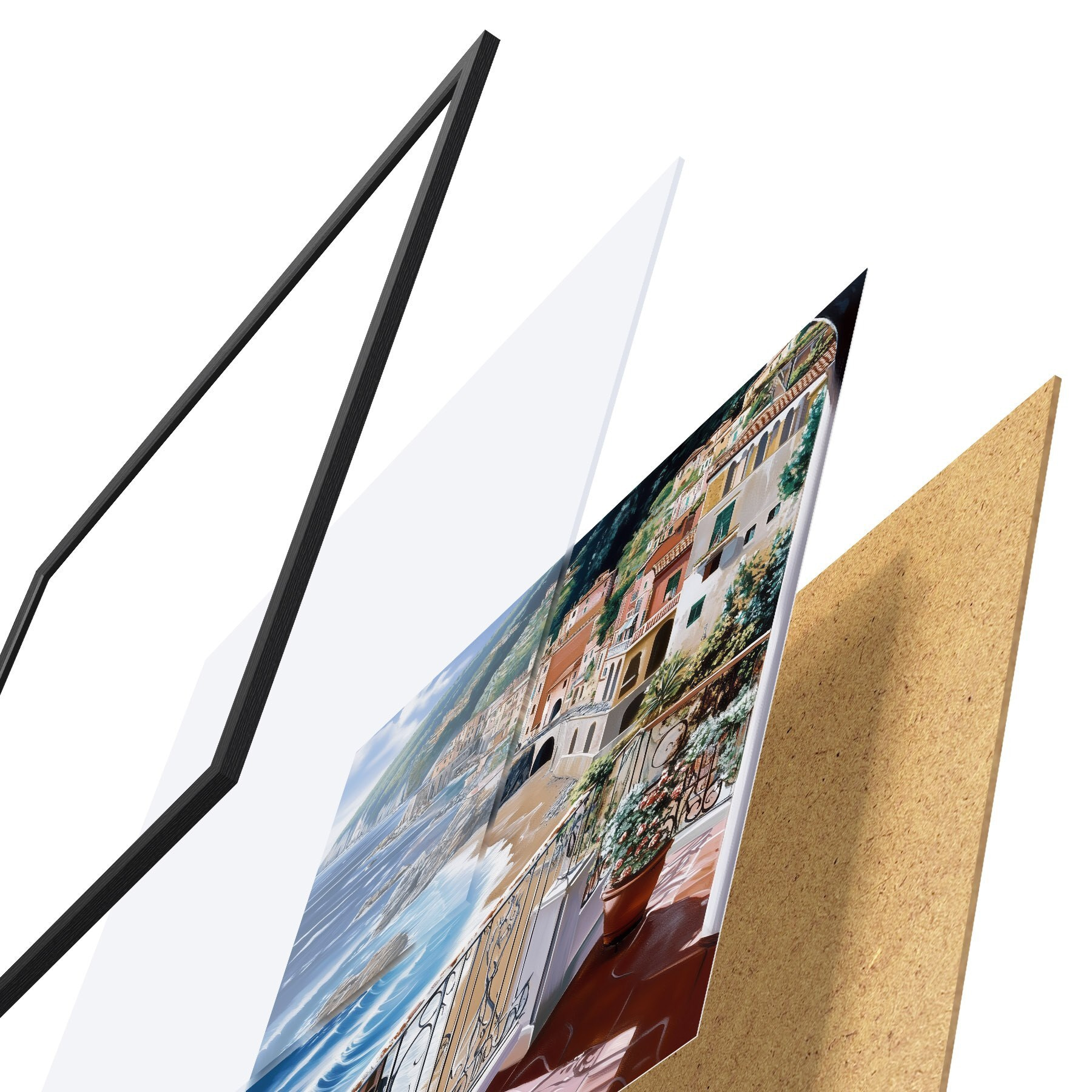 Das Poster besteht aus einem Rahmen, Plexiglas, einem gedruckten Bild und einer Rückwand aus Spanplatten. Dank der Halterungen auf der Rückseite kann das Poster sofort an die Wand gehängt werden.