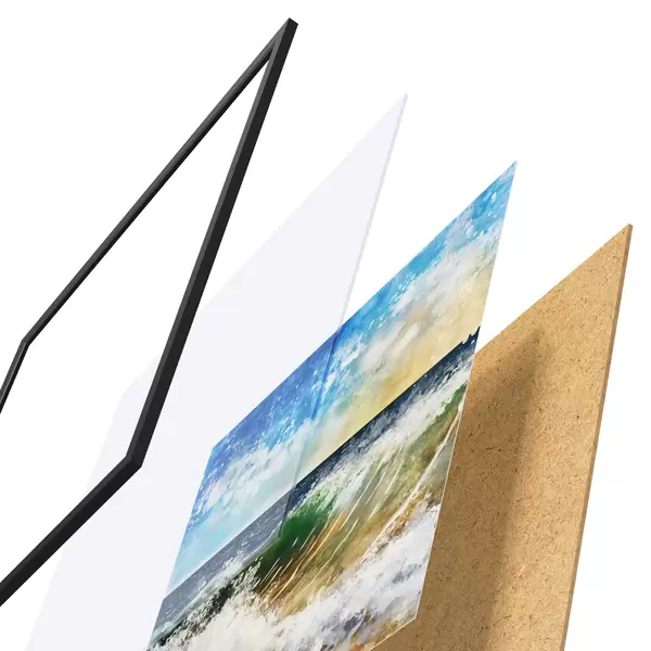 Das Poster besteht aus einem Rahmen, Plexiglas, einem gedruckten Bild und einer Rückwand aus Spanplatten. Dank der Halterungen auf der Rückseite kann das Poster sofort an die Wand gehängt werden.