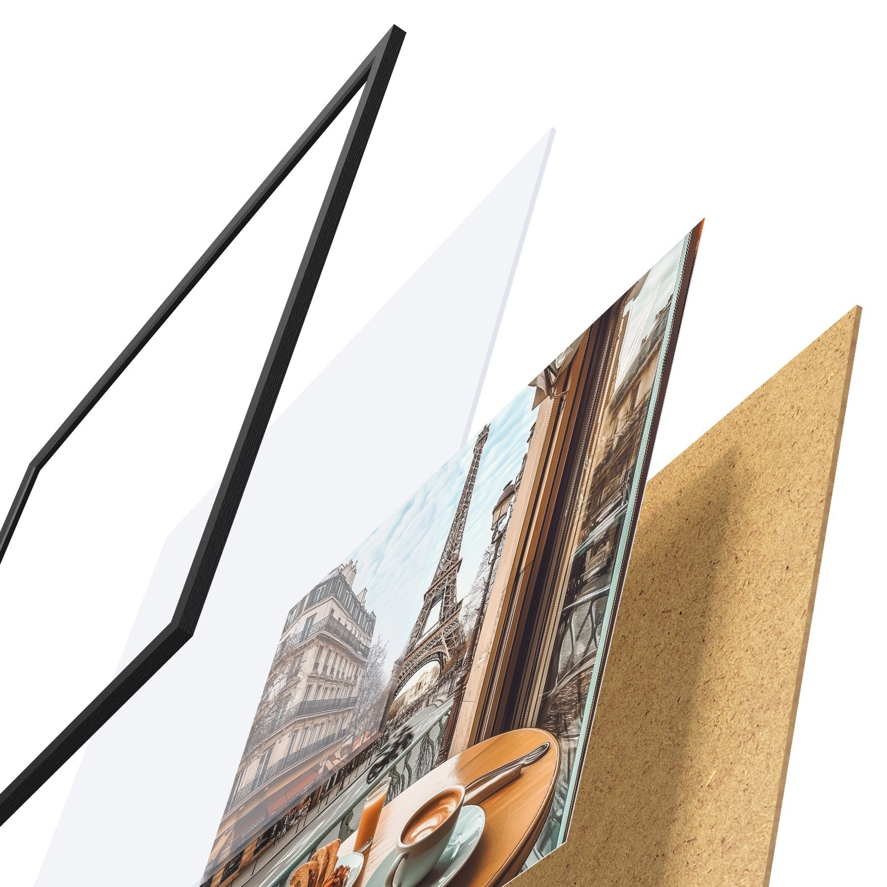Das Poster besteht aus einem Rahmen, Plexiglas, einem gedruckten Bild und einer Rückwand aus Spanplatten. Dank der Halterungen auf der Rückseite kann das Poster sofort an die Wand gehängt werden.