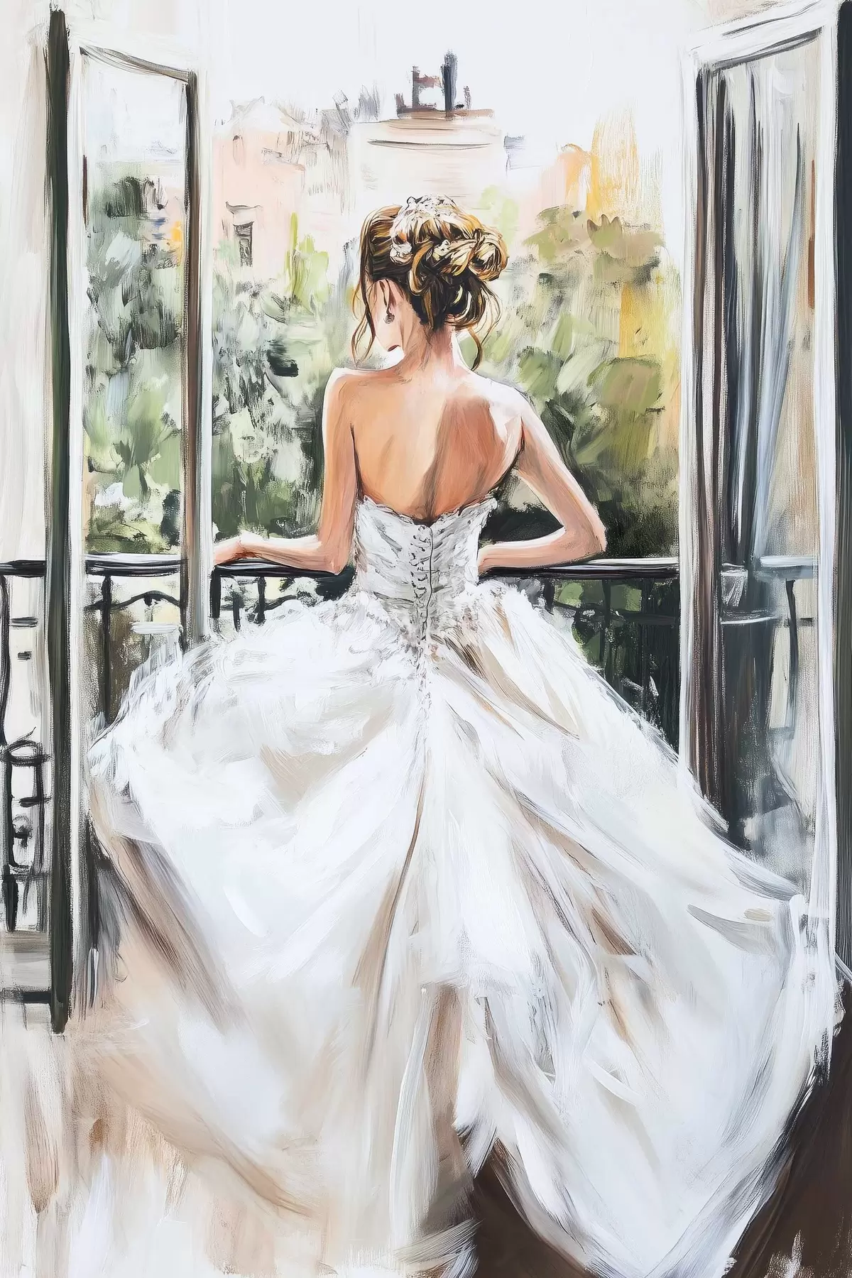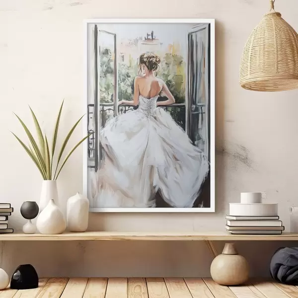 Poster Mädchen in einem weißen Kleid auf dem Balkon f44226