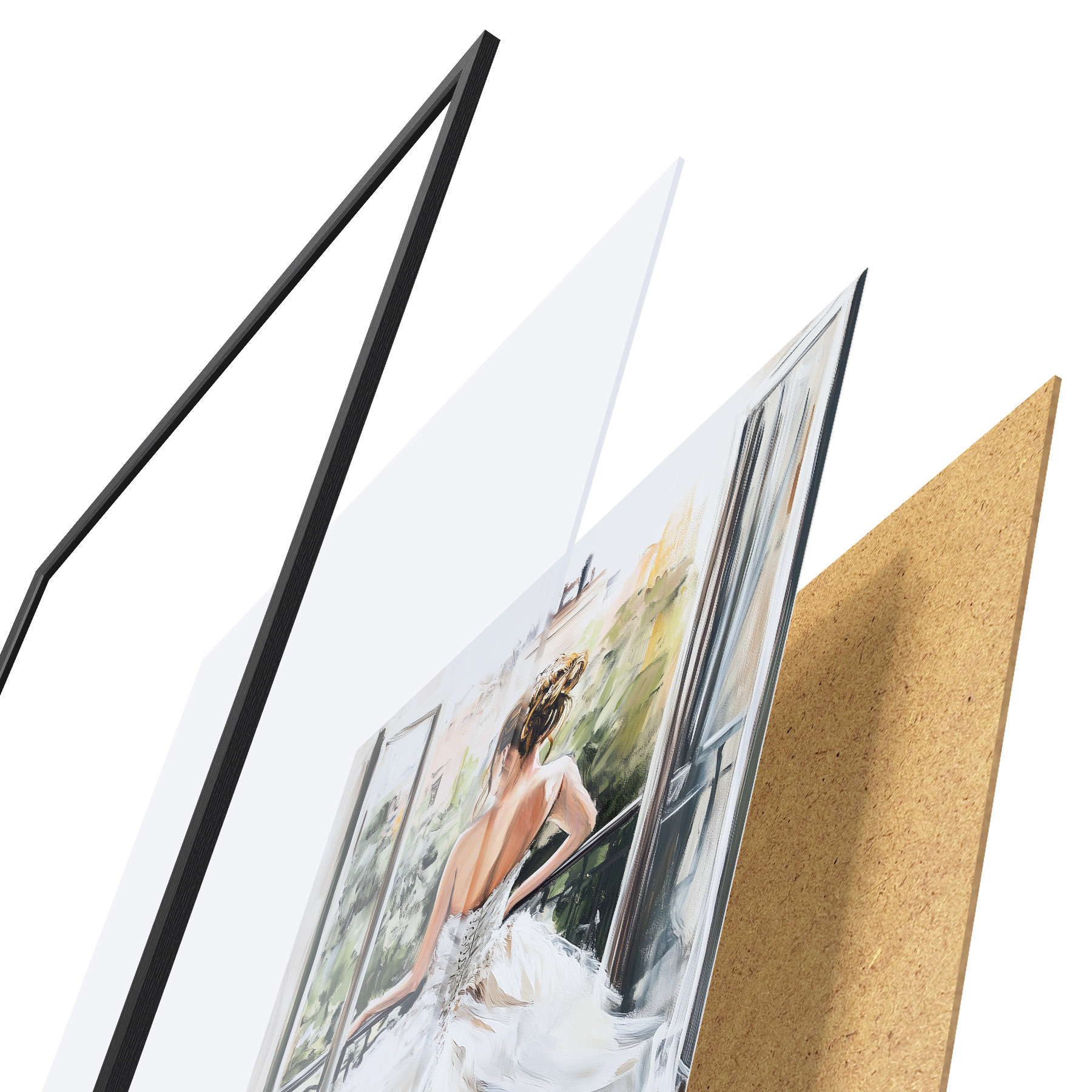 Das Poster besteht aus einem Rahmen, Plexiglas, einem gedruckten Bild und einer Rückwand aus Spanplatten. Dank der Halterungen auf der Rückseite kann das Poster sofort an die Wand gehängt werden.