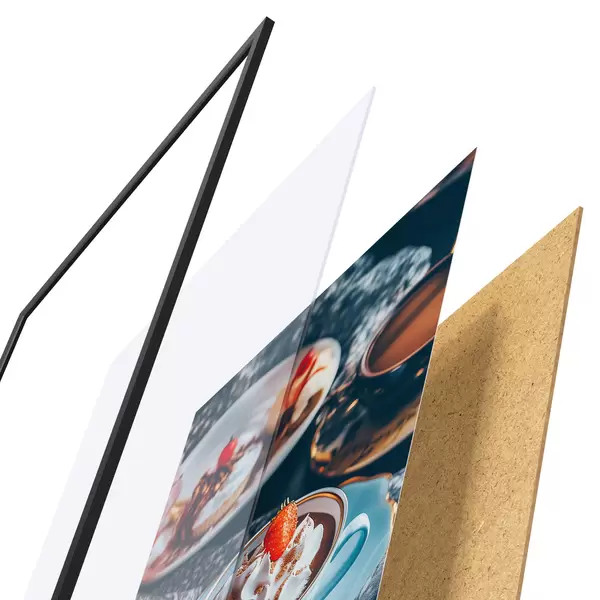 Das Poster besteht aus einem Rahmen, Plexiglas, einem gedruckten Bild und einer Rückwand aus Spanplatten. Dank der Halterungen auf der Rückseite kann das Poster sofort an die Wand gehängt werden.