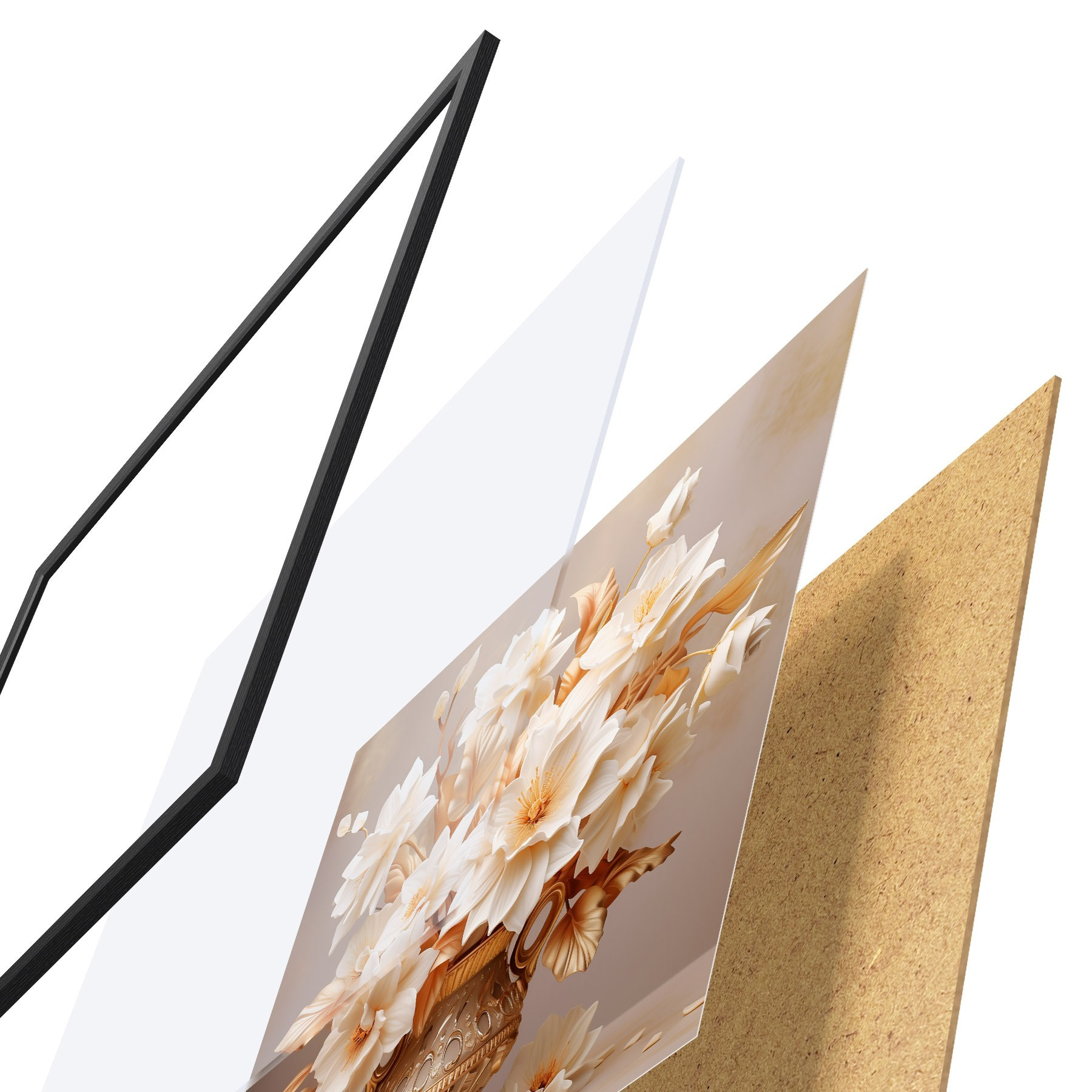 Das Poster besteht aus einem Rahmen, Plexiglas, einem gedruckten Bild und einer Rückwand aus Spanplatten. Dank der Halterungen auf der Rückseite kann das Poster sofort an die Wand gehängt werden.