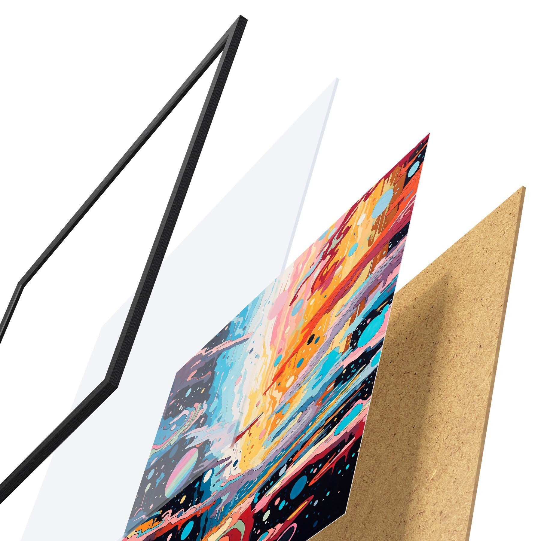 Das Poster besteht aus einem Rahmen, Plexiglas, einem gedruckten Bild und einer Rückwand aus Spanplatten. Dank der Halterungen auf der Rückseite kann das Poster sofort an die Wand gehängt werden.