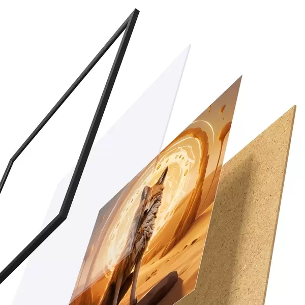 Das Poster besteht aus einem Rahmen, Plexiglas, einem gedruckten Bild und einer Rückwand aus Spanplatten. Dank der Halterungen auf der Rückseite kann das Poster sofort an die Wand gehängt werden.