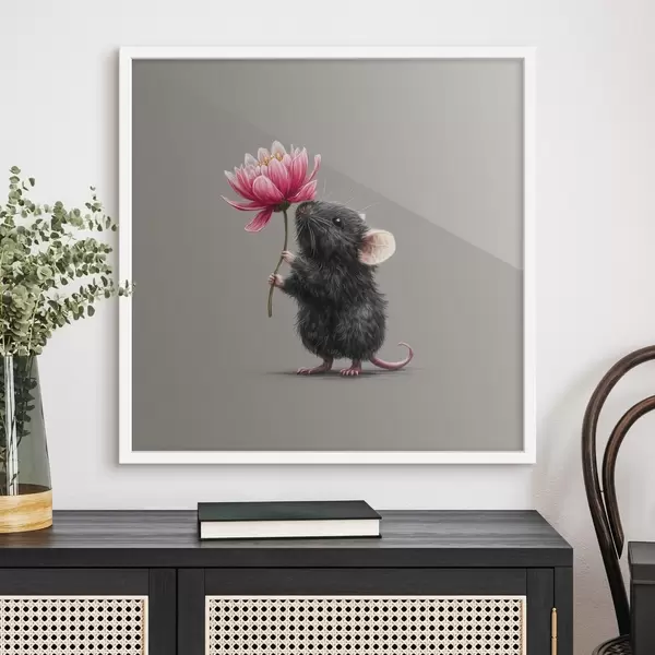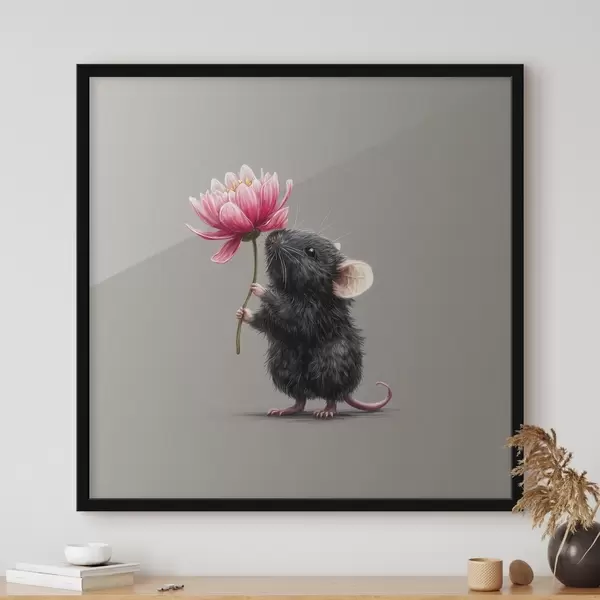 Poster Charmante Maus inhaliert den Duft einer rosa Pfingstrose f44248