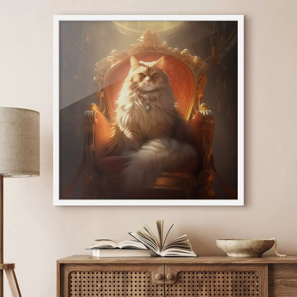 Poster Regal Katze mit bernsteinfarbenen Augen auf einem Thron in den Strahlen der Herrlichkeit im Barock-Stil f44250