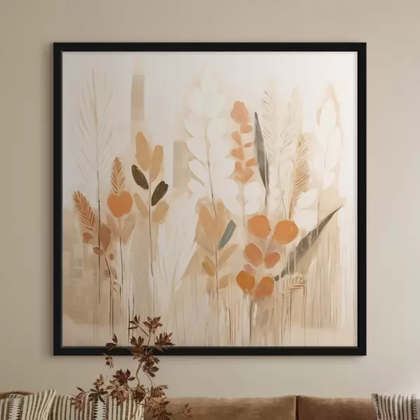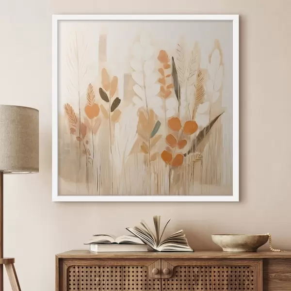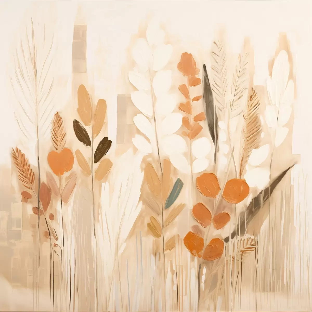 Poster Warme Abstraktion mit Gräsern und Blumen in einer beige-orangefarbenen Palette im Jugendstil Nr f44252