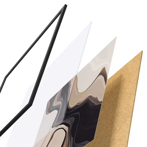 Das Poster besteht aus einem Rahmen, Plexiglas, einem gedruckten Bild und einer Rückwand aus Spanplatten. Dank der Halterungen auf der Rückseite kann das Poster sofort an die Wand gehängt werden.