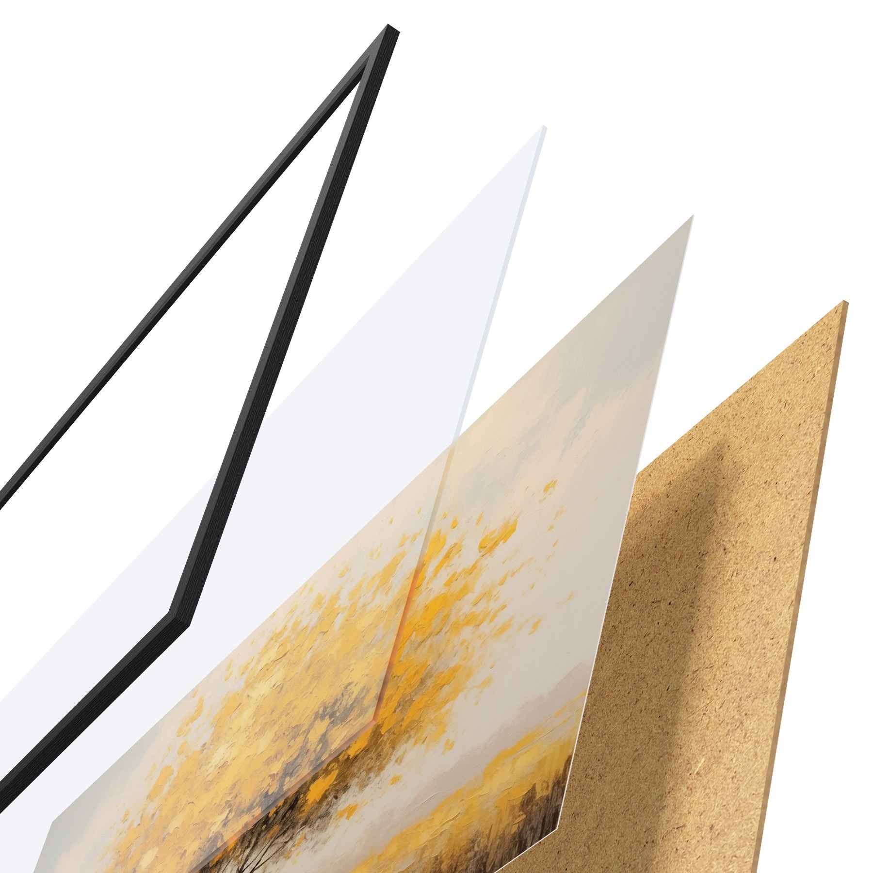 Das Poster besteht aus einem Rahmen, Plexiglas, einem gedruckten Bild und einer Rückwand aus Spanplatten. Dank der Halterungen auf der Rückseite kann das Poster sofort an die Wand gehängt werden.