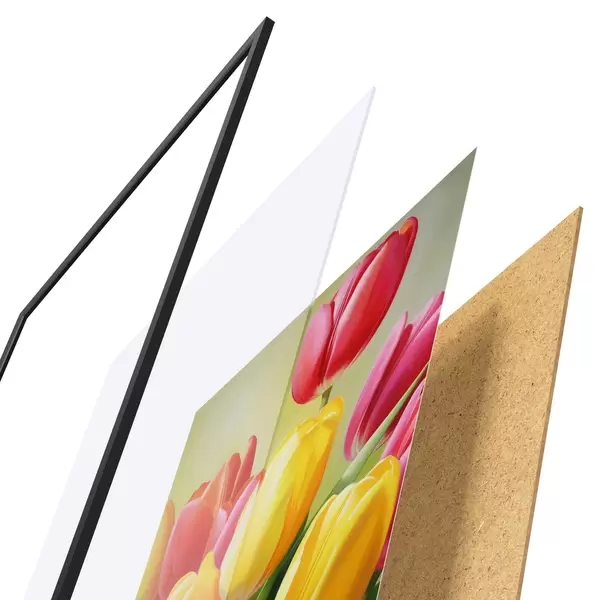 Das Poster besteht aus einem Rahmen, Plexiglas, einem gedruckten Bild und einer Rückwand aus Spanplatten. Dank der Halterungen auf der Rückseite kann das Poster sofort an die Wand gehängt werden.