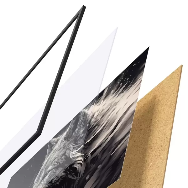Das Poster besteht aus einem Rahmen, Plexiglas, einem gedruckten Bild und einer Rückwand aus Spanplatten. Dank der Halterungen auf der Rückseite kann das Poster sofort an die Wand gehängt werden.
