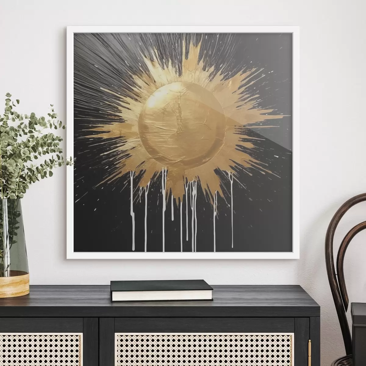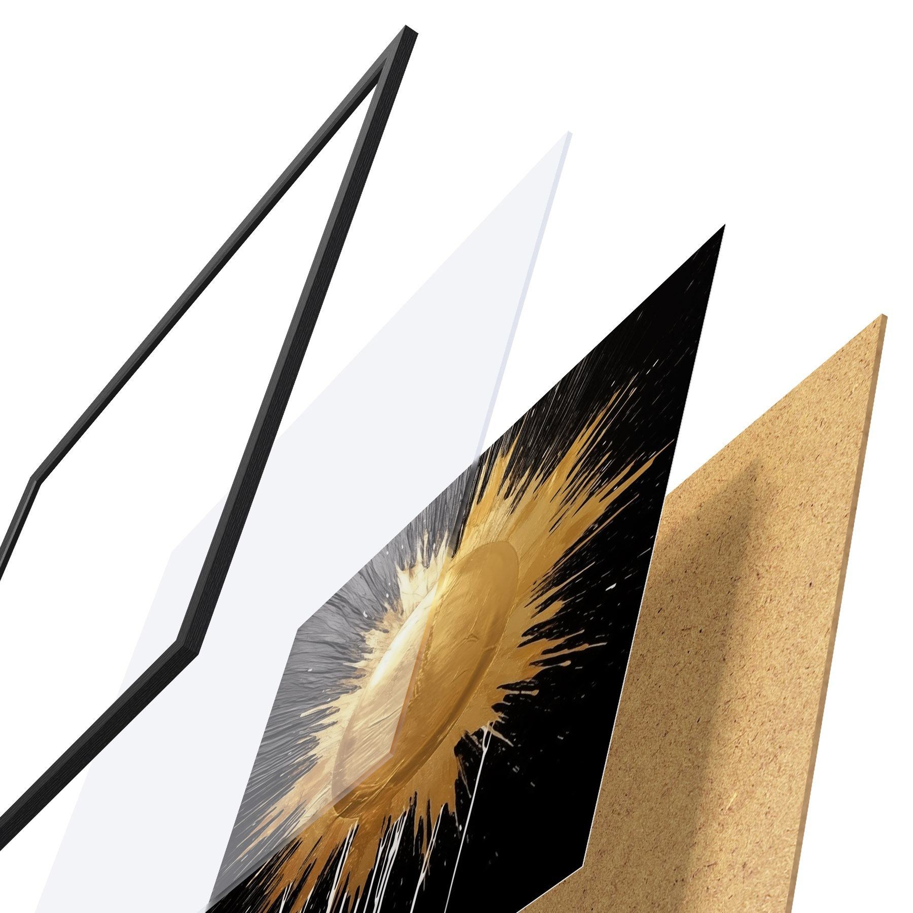 Das Poster besteht aus einem Rahmen, Plexiglas, einem gedruckten Bild und einer Rückwand aus Spanplatten. Dank der Halterungen auf der Rückseite kann das Poster sofort an die Wand gehängt werden.