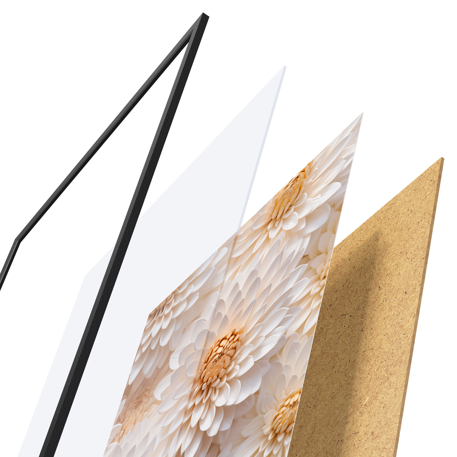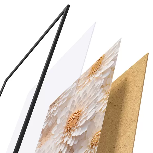 Das Poster besteht aus einem Rahmen, Plexiglas, einem gedruckten Bild und einer Rückwand aus Spanplatten. Dank der Halterungen auf der Rückseite kann das Poster sofort an die Wand gehängt werden.