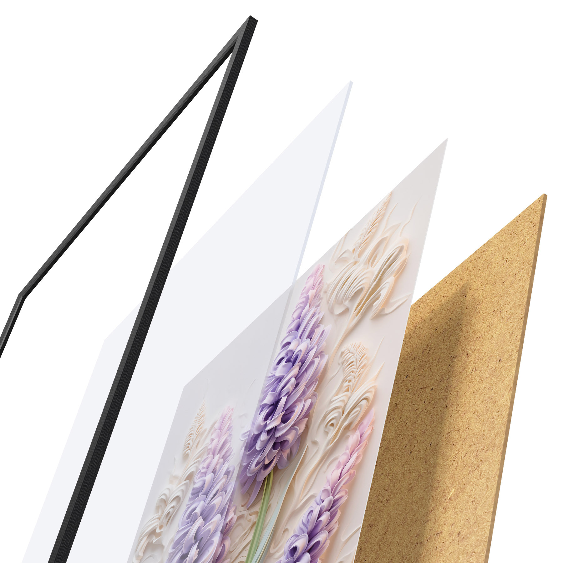 Das Poster besteht aus einem Rahmen, Plexiglas, einem gedruckten Bild und einer Rückwand aus Spanplatten. Dank der Halterungen auf der Rückseite kann das Poster sofort an die Wand gehängt werden.