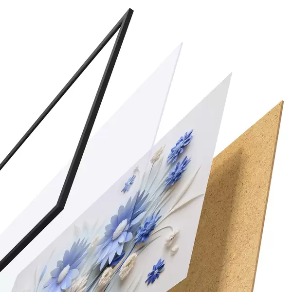 Das Poster besteht aus einem Rahmen, Plexiglas, einem gedruckten Bild und einer Rückwand aus Spanplatten. Dank der Halterungen auf der Rückseite kann das Poster sofort an die Wand gehängt werden.