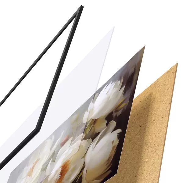 Das Poster besteht aus einem Rahmen, Plexiglas, einem gedruckten Bild und einer Rückwand aus Spanplatten. Dank der Halterungen auf der Rückseite kann das Poster sofort an die Wand gehängt werden.