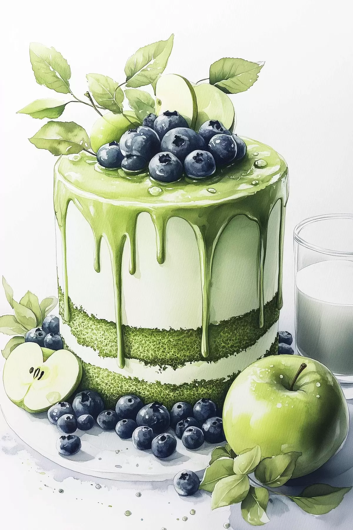 Poster Matcha-Kuchen mit Blaubeeren und Äpfeln, Aquarellstil Nr f44304