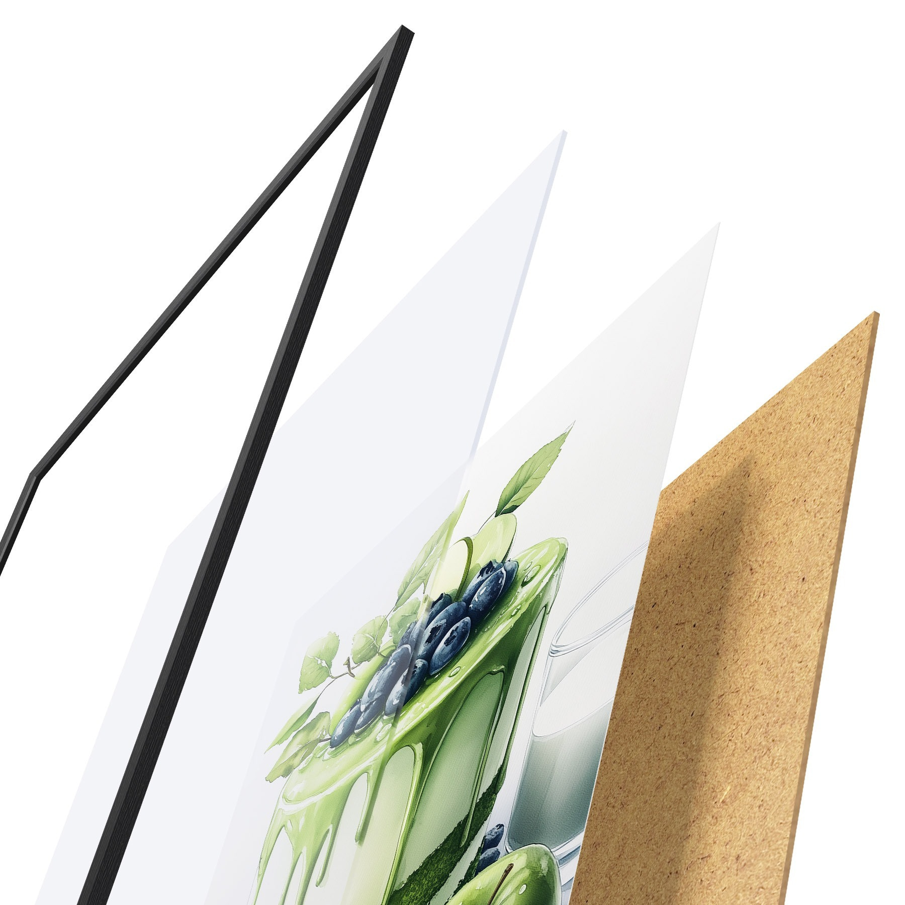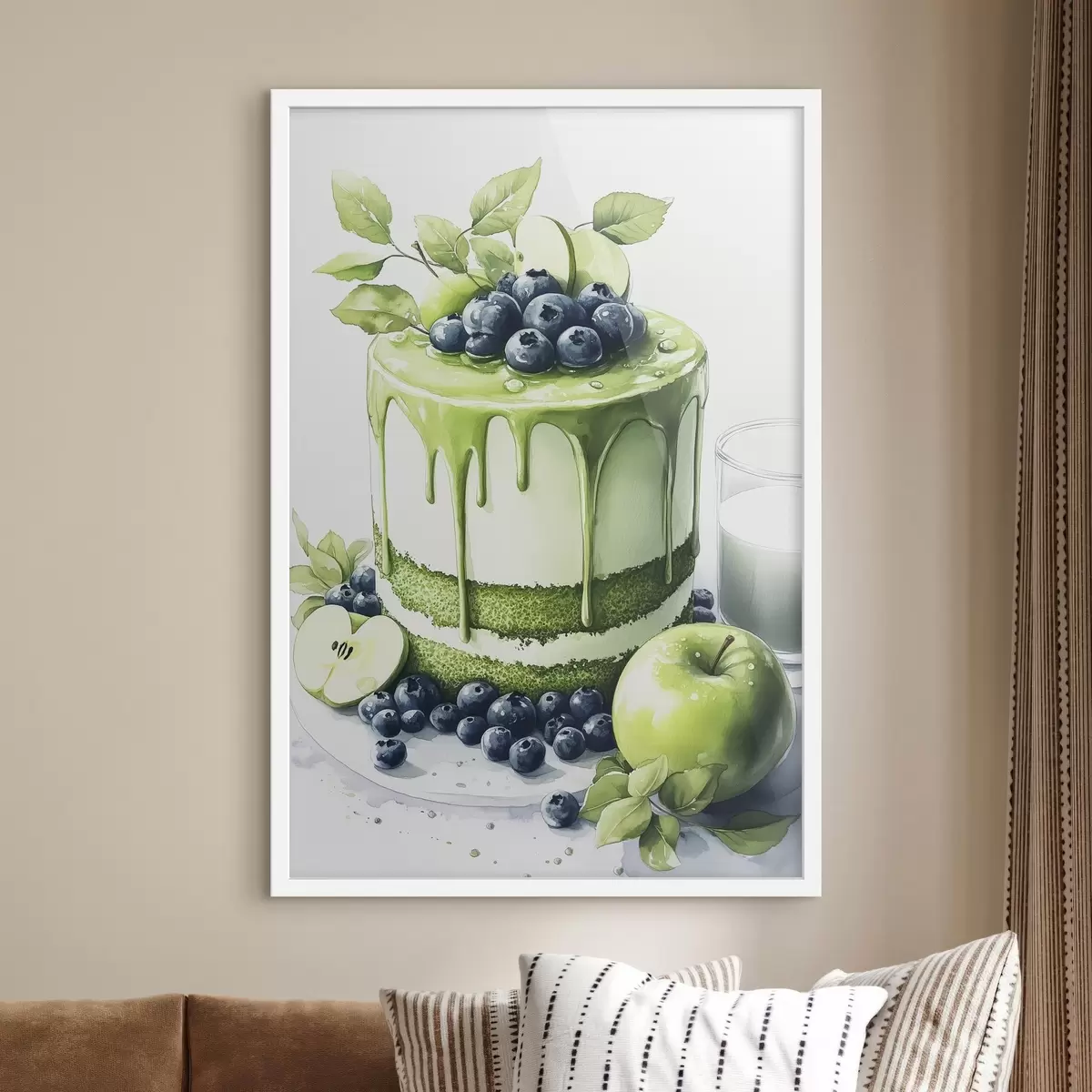 Poster Matcha-Kuchen mit Blaubeeren und Äpfeln, Aquarellstil f44304