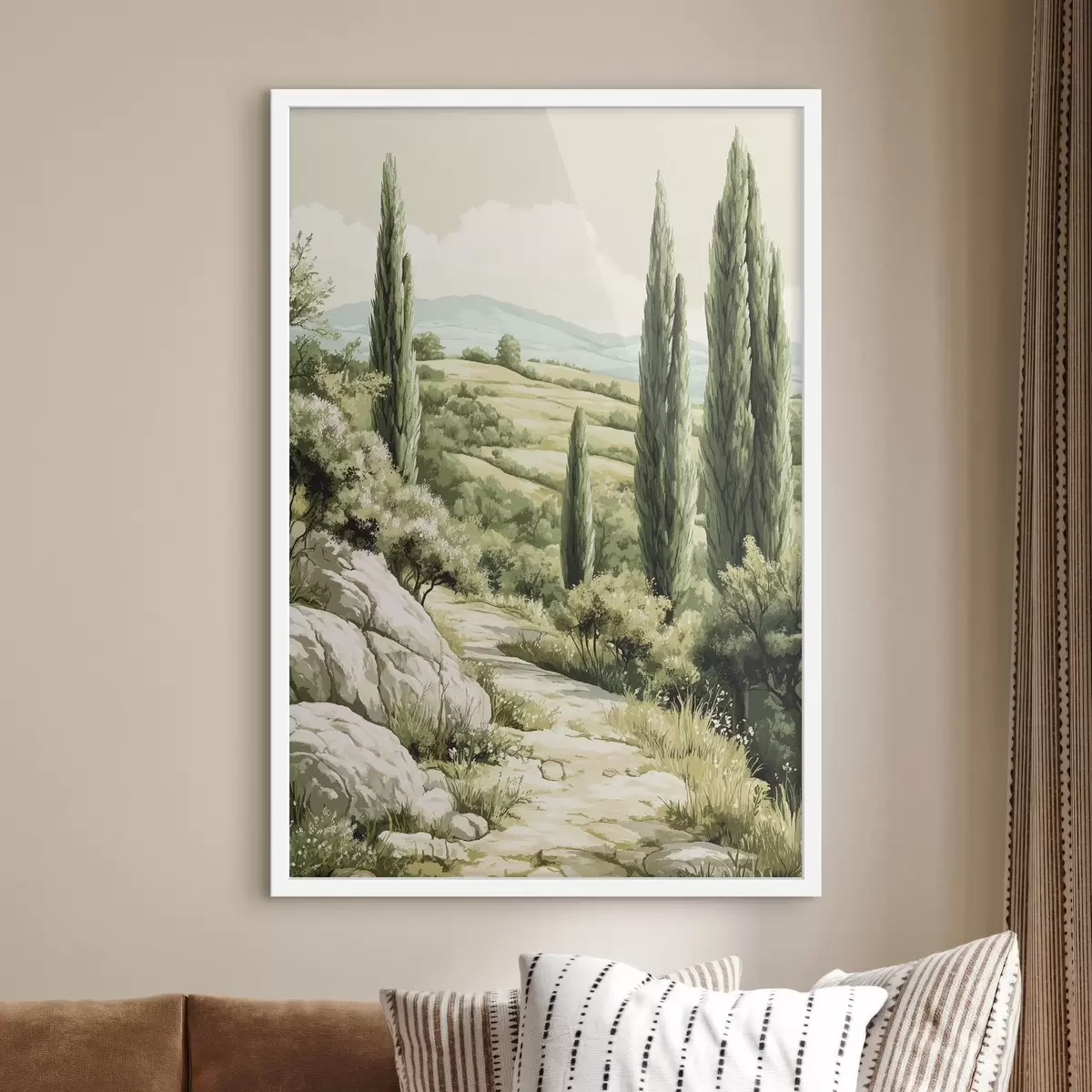 Poster Sommerlandschaften mit Zypressen und grünen Hügeln, rustikaler Stil Nr f44308