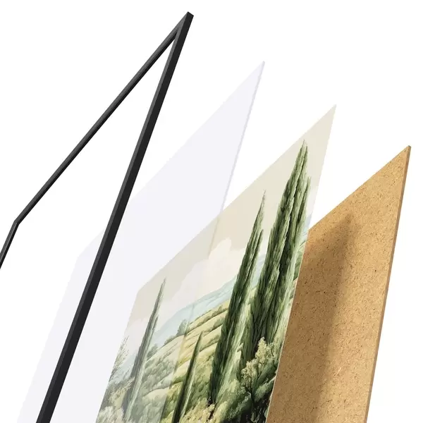 Das Poster besteht aus einem Rahmen, Plexiglas, einem gedruckten Bild und einer Rückwand aus Spanplatten. Dank der Halterungen auf der Rückseite kann das Poster sofort an die Wand gehängt werden.