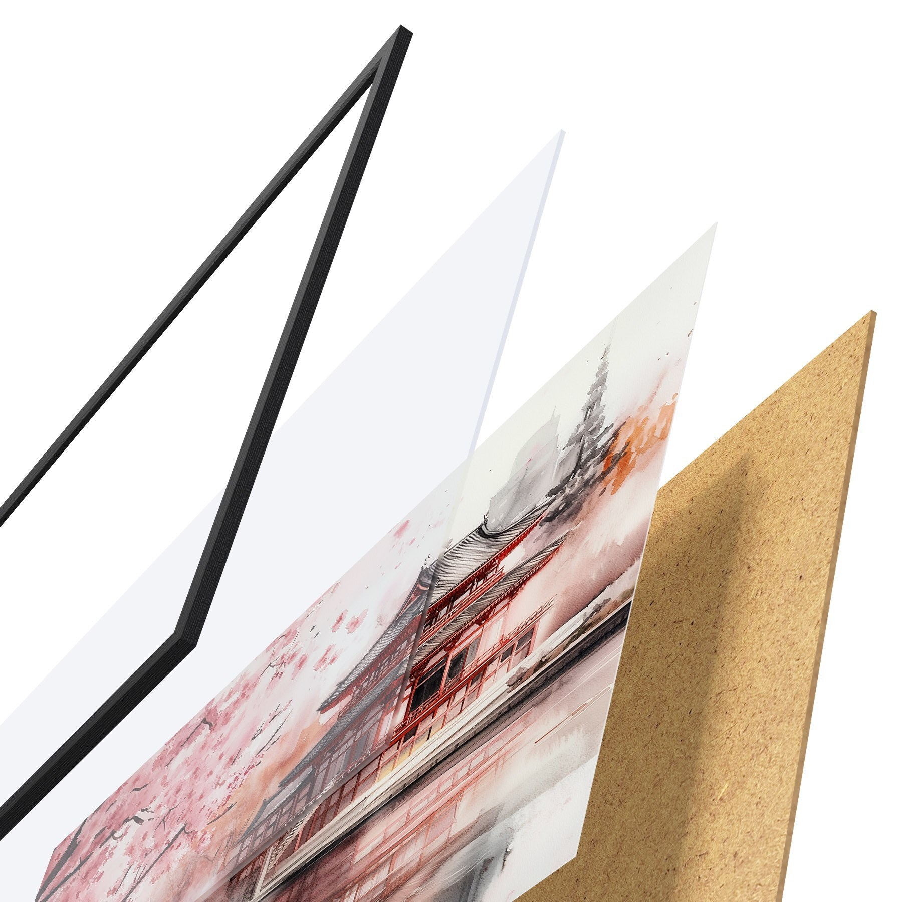 Das Poster besteht aus einem Rahmen, Plexiglas, einem gedruckten Bild und einer Rückwand aus Spanplatten. Dank der Halterungen auf der Rückseite kann das Poster sofort an die Wand gehängt werden.