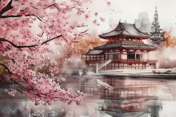 Poster Schöne japanische Landschaft mit blühendem Kirschbaum und Haus am See Nr f44310