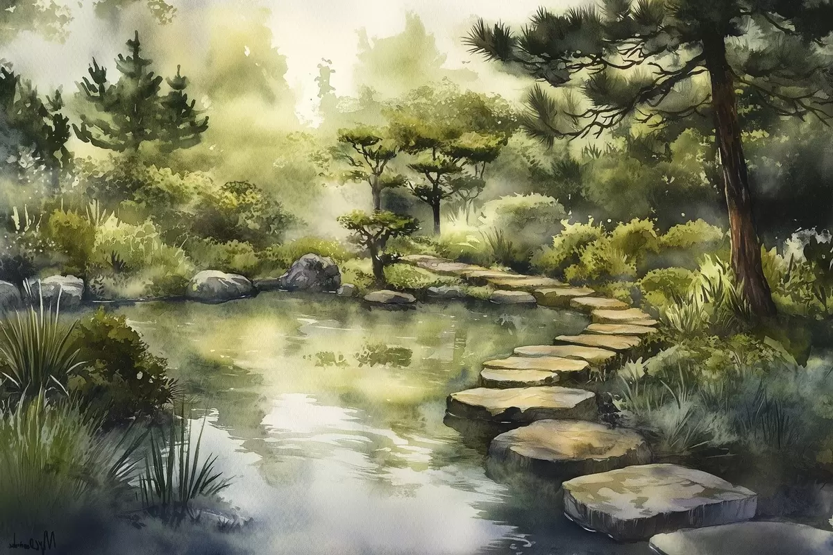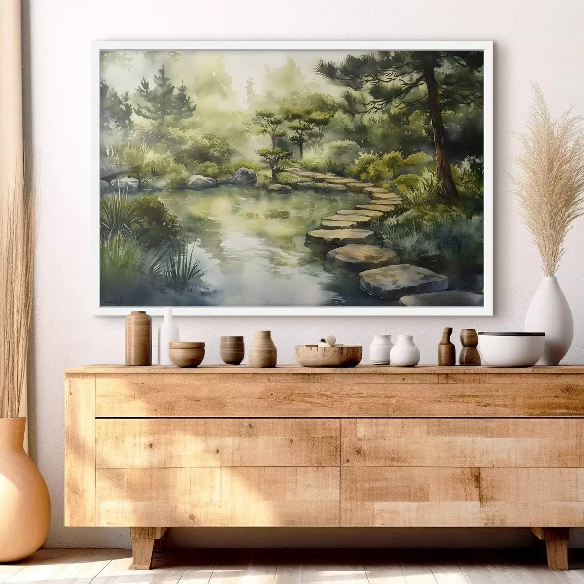 Poster Orientalischer Wald mit Felsen, Teich und Kiefern, Grünzeug, Aquarellstil Nr f44311