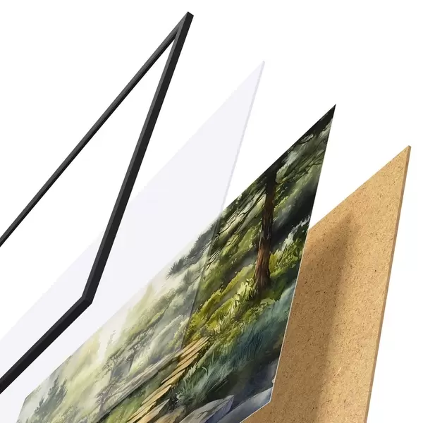 Das Poster besteht aus einem Rahmen, Plexiglas, einem gedruckten Bild und einer Rückwand aus Spanplatten. Dank der Halterungen auf der Rückseite kann das Poster sofort an die Wand gehängt werden.