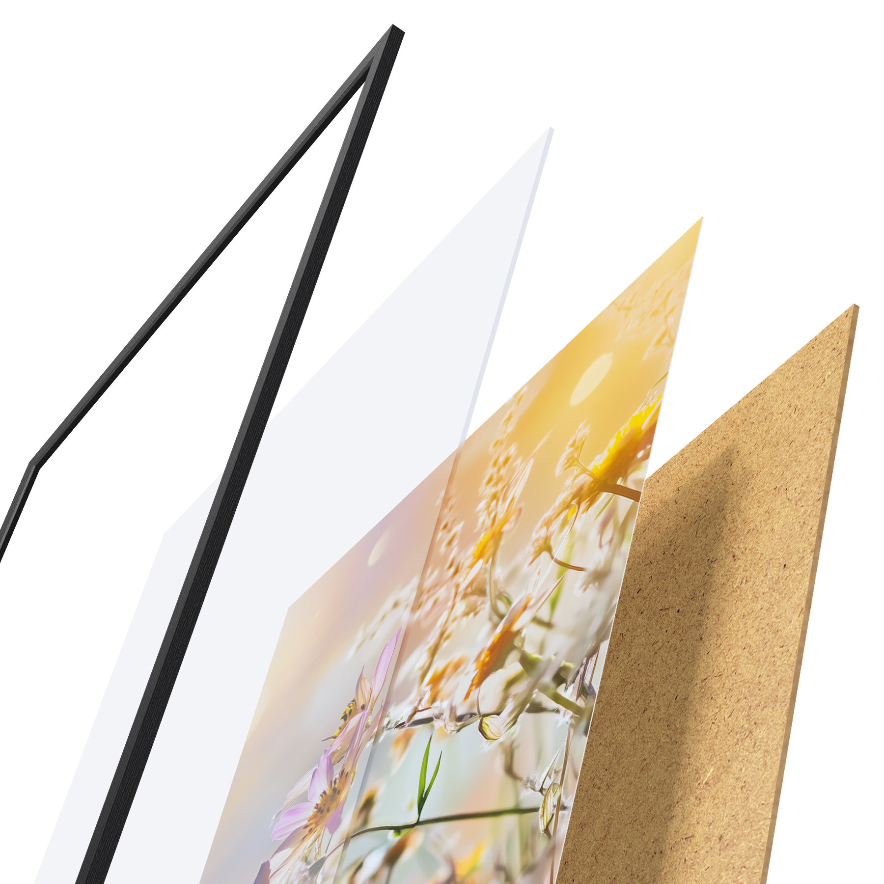 Das Poster besteht aus einem Rahmen, Plexiglas, einem gedruckten Bild und einer Rückwand aus Spanplatten. Dank der Halterungen auf der Rückseite kann das Poster sofort an die Wand gehängt werden.