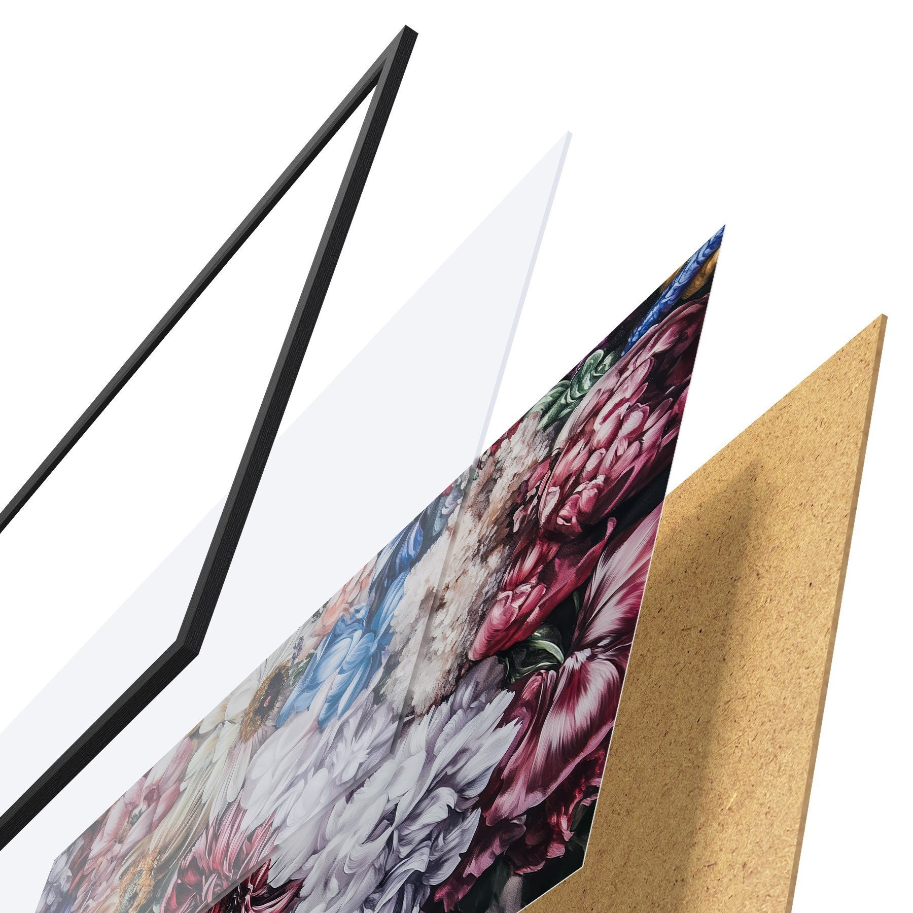 Das Poster besteht aus einem Rahmen, Plexiglas, einem gedruckten Bild und einer Rückwand aus Spanplatten. Dank der Halterungen auf der Rückseite kann das Poster sofort an die Wand gehängt werden.