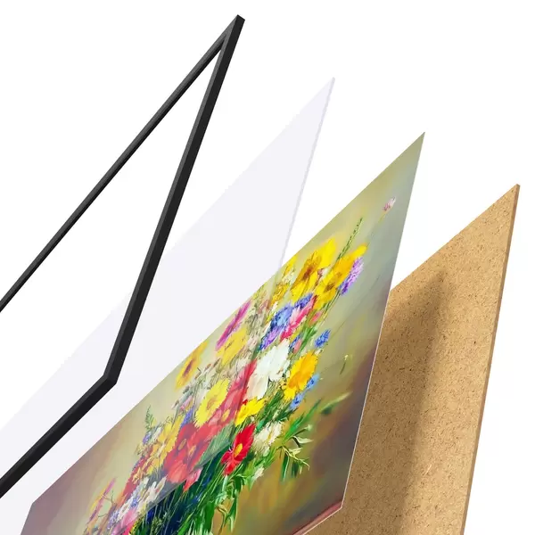 Das Poster besteht aus einem Rahmen, Plexiglas, einem gedruckten Bild und einer Rückwand aus Spanplatten. Dank der Halterungen auf der Rückseite kann das Poster sofort an die Wand gehängt werden.