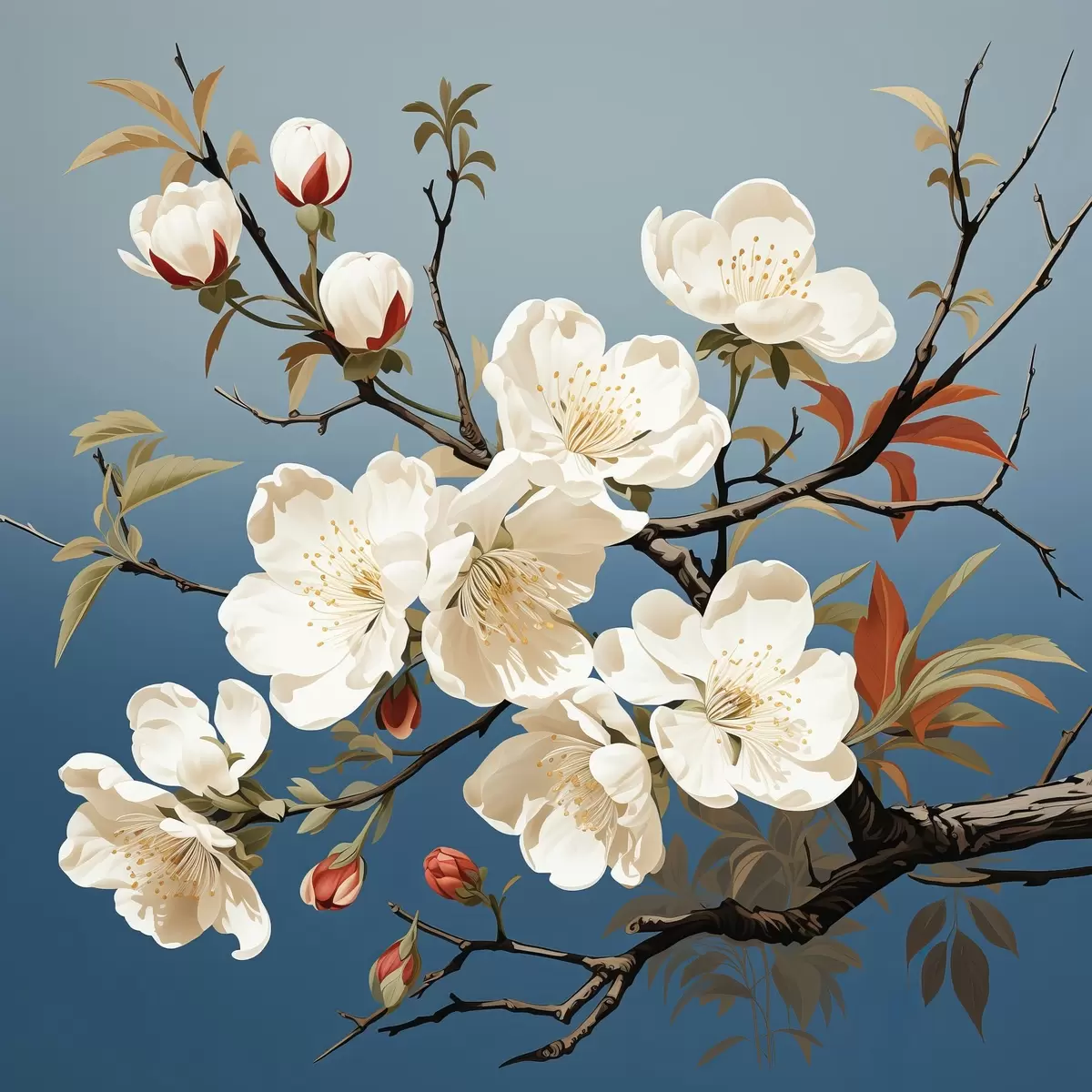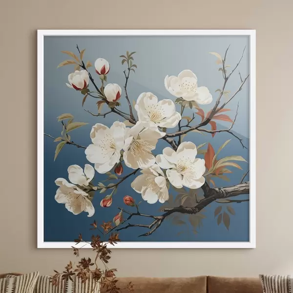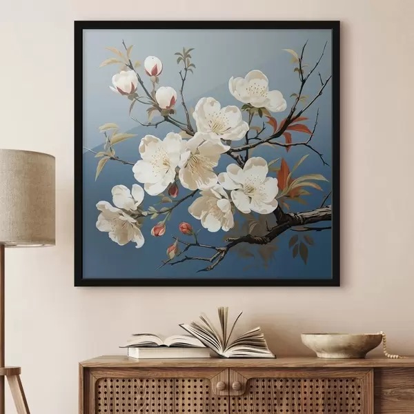 Poster Magnolienzweig mit rötlichen Knospen auf blauem Hintergrund Nr f44341