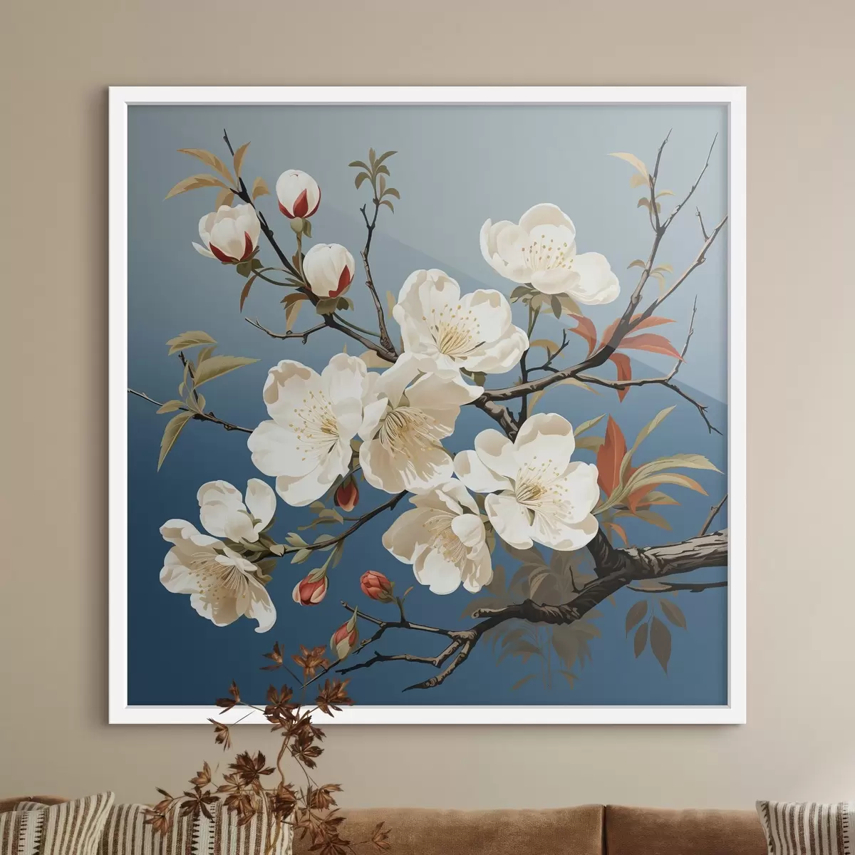 Poster Magnolienzweig mit rötlichen Knospen auf blauem Hintergrund f44341