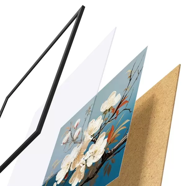 Das Poster besteht aus einem Rahmen, Plexiglas, einem gedruckten Bild und einer Rückwand aus Spanplatten. Dank der Halterungen auf der Rückseite kann das Poster sofort an die Wand gehängt werden.