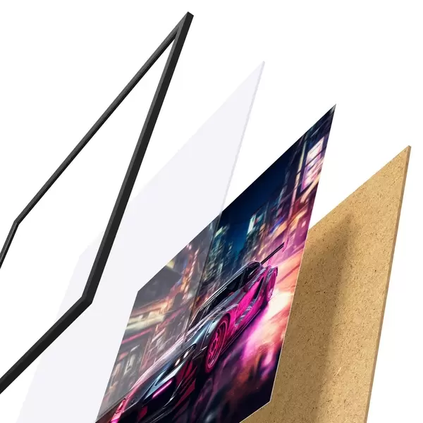 Das Poster besteht aus einem Rahmen, Plexiglas, einem gedruckten Bild und einer Rückwand aus Spanplatten. Dank der Halterungen auf der Rückseite kann das Poster sofort an die Wand gehängt werden.