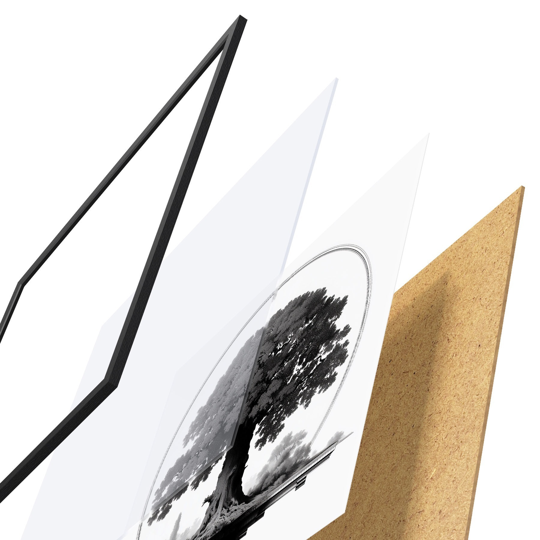 Das Poster besteht aus einem Rahmen, Plexiglas, einem gedruckten Bild und einer Rückwand aus Spanplatten. Dank der Halterungen auf der Rückseite kann das Poster sofort an die Wand gehängt werden.
