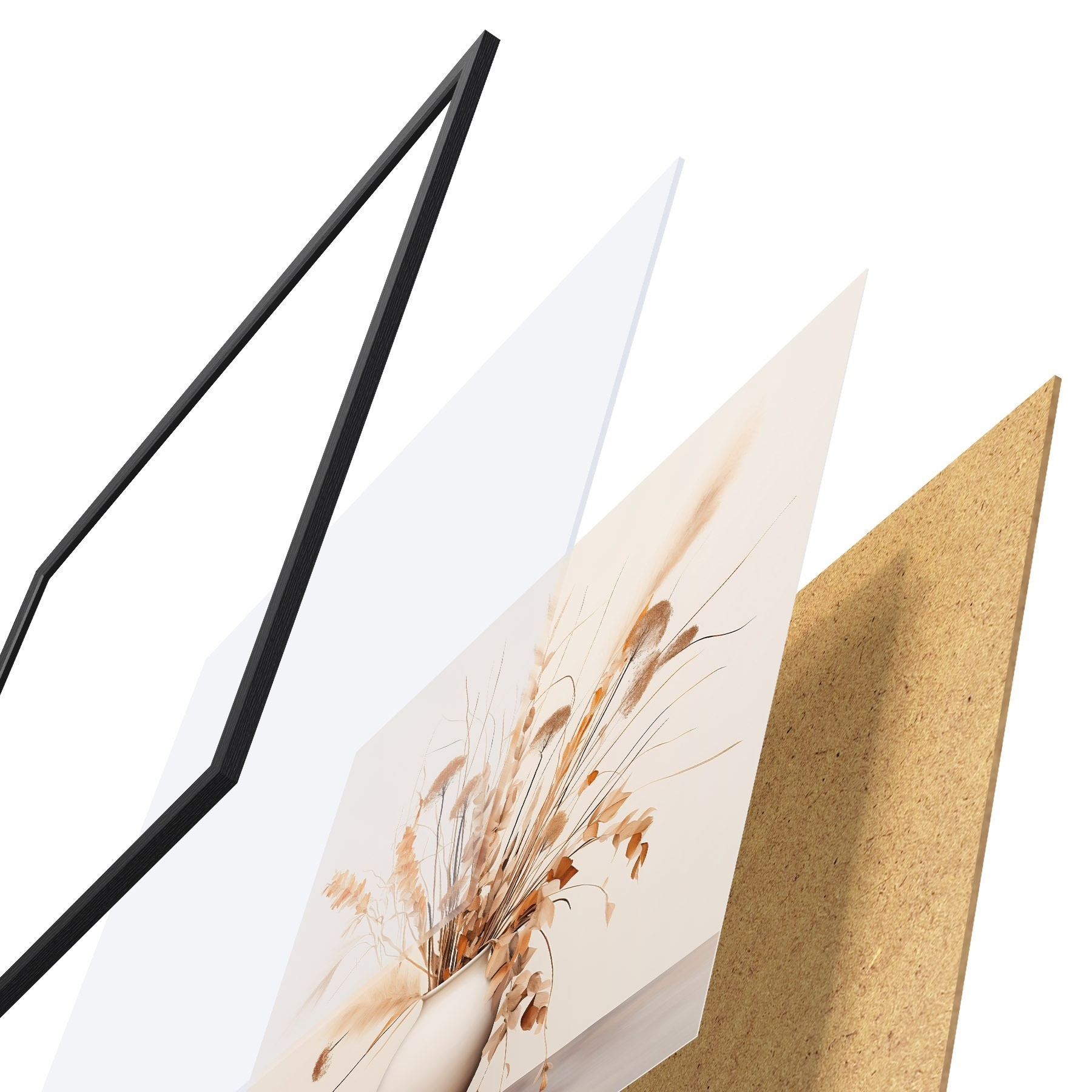 Das Poster besteht aus einem Rahmen, Plexiglas, einem gedruckten Bild und einer Rückwand aus Spanplatten. Dank der Halterungen auf der Rückseite kann das Poster sofort an die Wand gehängt werden.