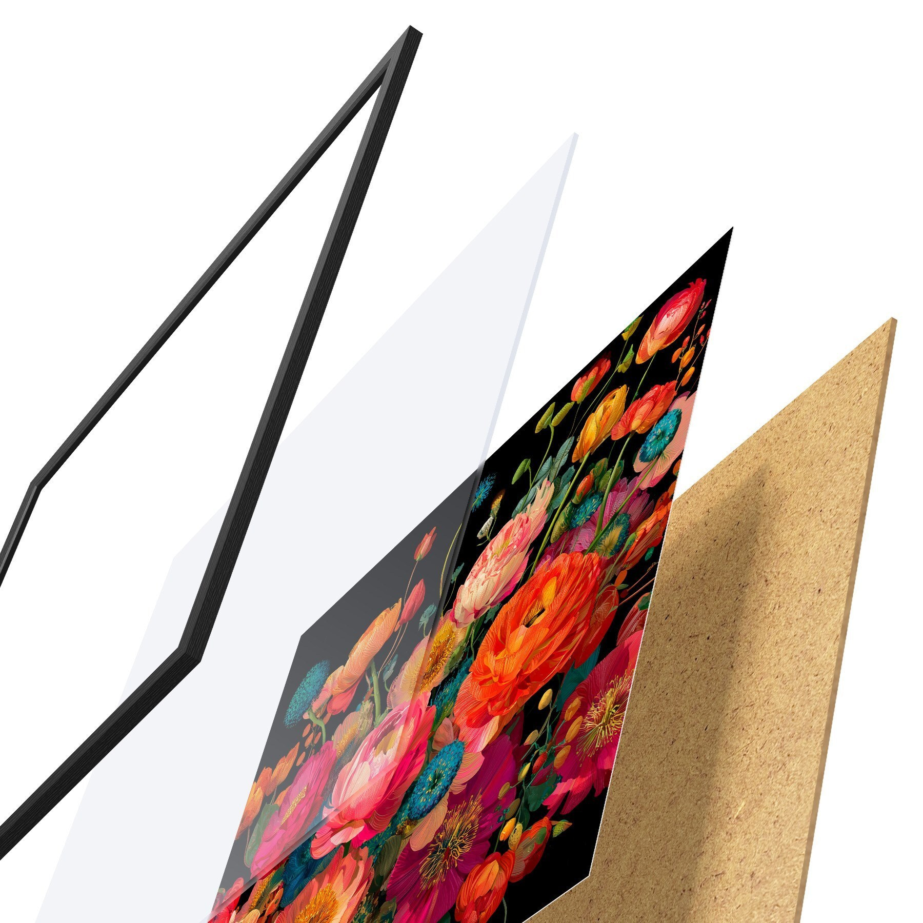 Das Poster besteht aus einem Rahmen, Plexiglas, einem gedruckten Bild und einer Rückwand aus Spanplatten. Dank der Halterungen auf der Rückseite kann das Poster sofort an die Wand gehängt werden.