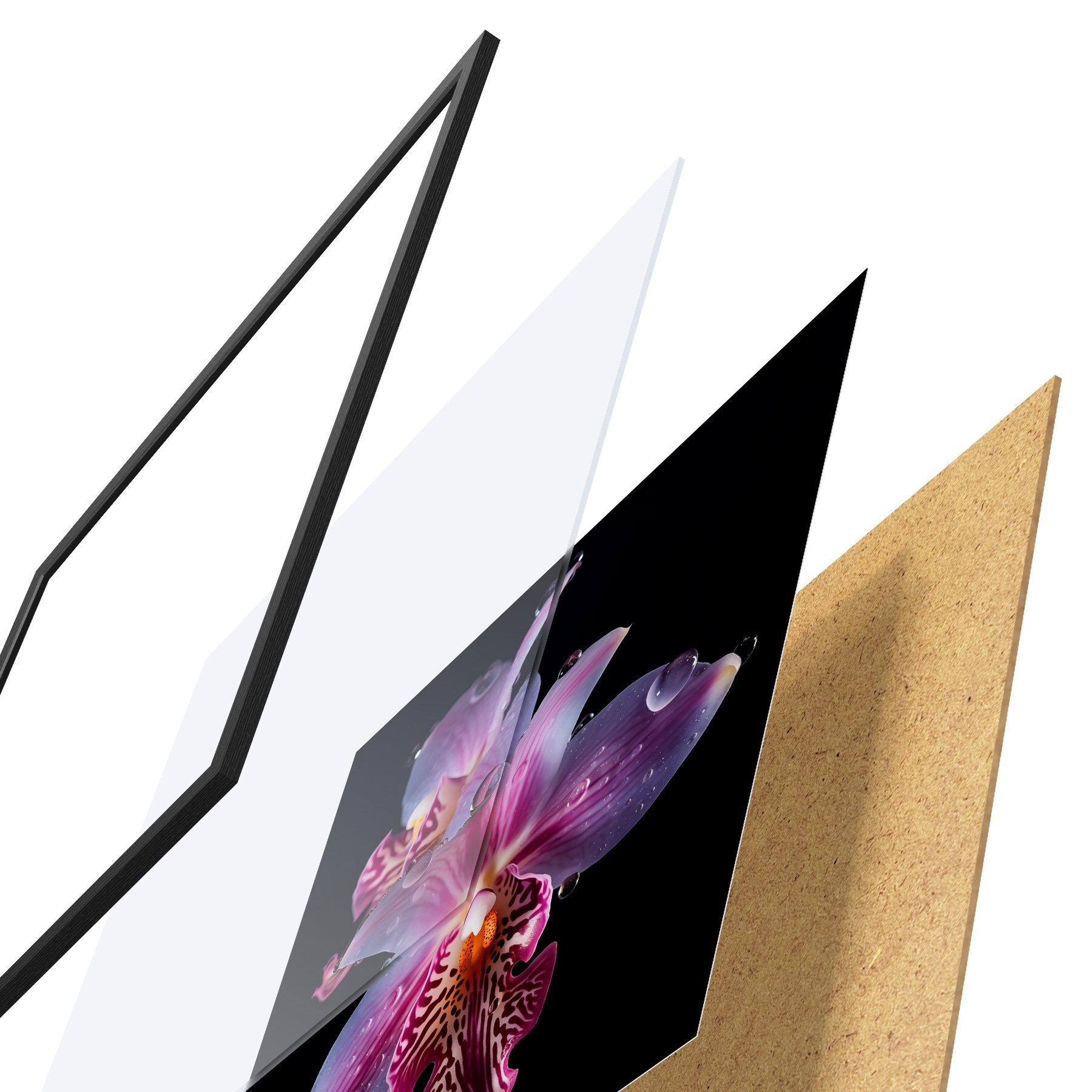 Das Poster besteht aus einem Rahmen, Plexiglas, einem gedruckten Bild und einer Rückwand aus Spanplatten. Dank der Halterungen auf der Rückseite kann das Poster sofort an die Wand gehängt werden.
