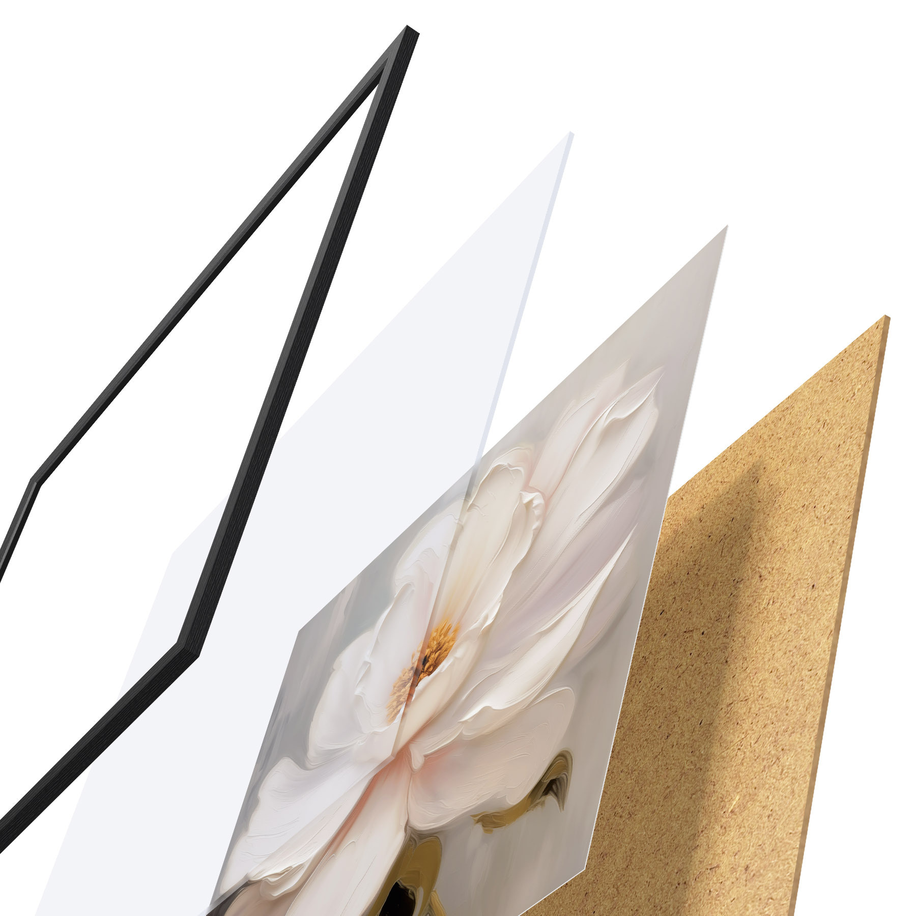 Das Poster besteht aus einem Rahmen, Plexiglas, einem gedruckten Bild und einer Rückwand aus Spanplatten. Dank der Halterungen auf der Rückseite kann das Poster sofort an die Wand gehängt werden.
